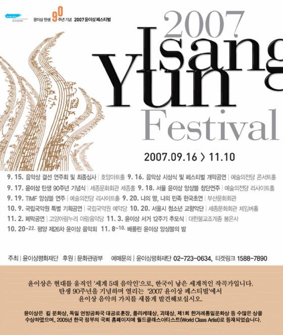 - 2007 윤이상 페스티벌 개막공연 (9/16 16:00, 예술의 전당 콘서트홀)