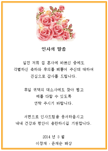 | ▨ RE:이창재 집사님 장남(종훈)결혼식 공지 |